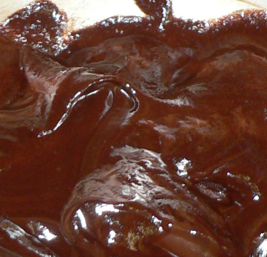 Melt the butter, cream, and chocolate in the double boiler, then turn off the heat. Whisk the two egg yolks into the chocolate. It will seize, just stir until smooth.